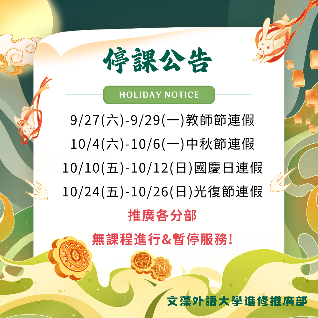 【進修推廣部】9/27-9/29教師節連假、10/4-10/6中秋節連假、10/10-10/12國慶日連假、10/24-10/26光復節連假,推廣各分部辦公室暫停服務! Notice of Class Suspension