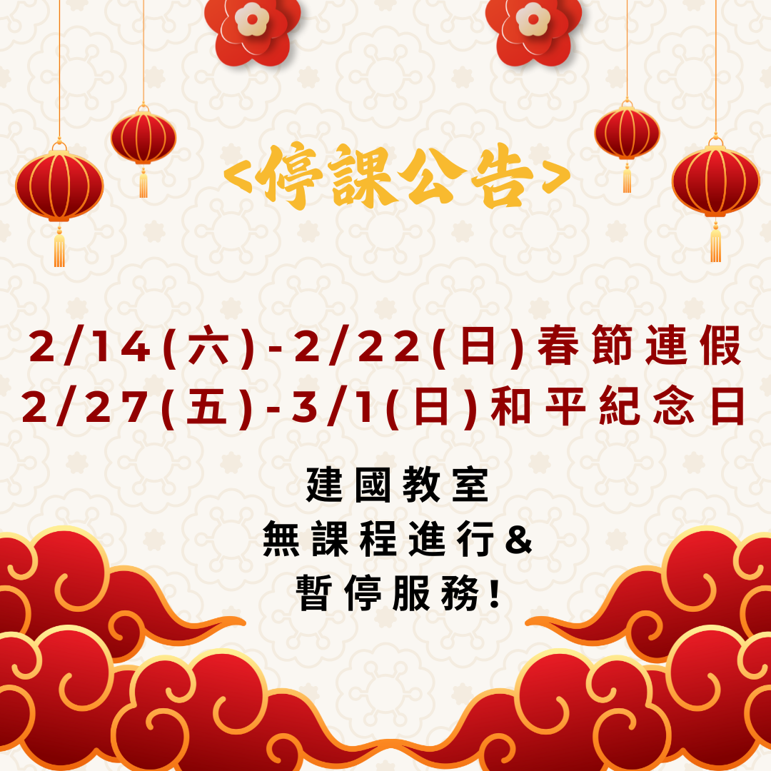 【建國教室停課公告】115/2/14(六)-2/22(日)春節連假及2/27(五)-3/1(日)和平紀念日停課,建國教室無課程進行及暫停服務!
