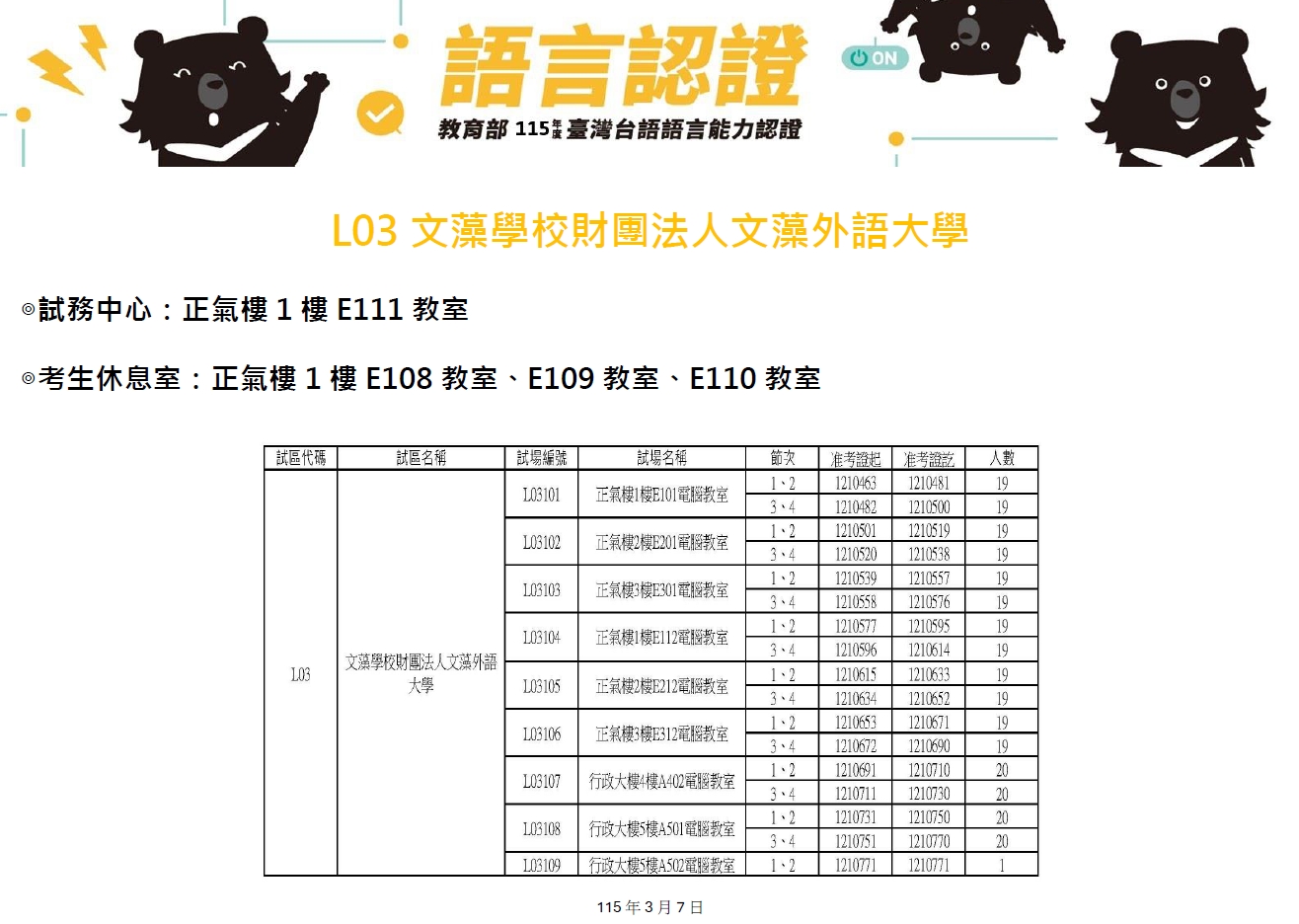 【文藻試區】115年3月7日(週六)台語語言能力認證測驗考場資訊